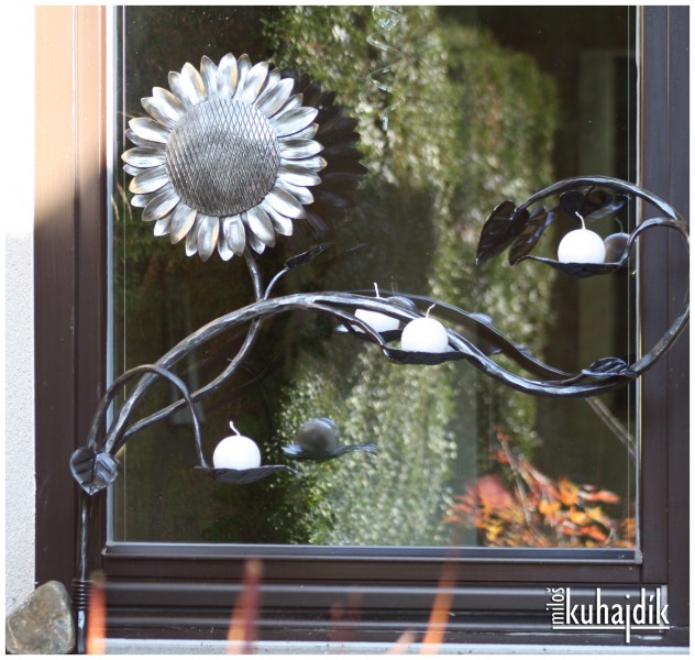 Plastika se slunečnicí v podobě svícnu do schodišťového výklenku